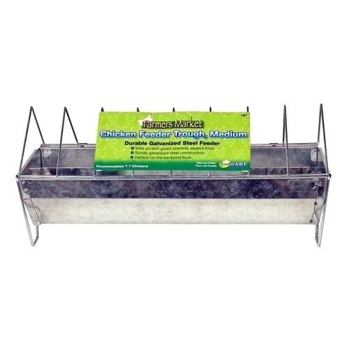 Farmers market 16″ galvanized steel chicken feeder trough. Trough features a wire scratch guard to help prevent feed loss. Spill reducing design Sturdy galvanized steel 16 inches long