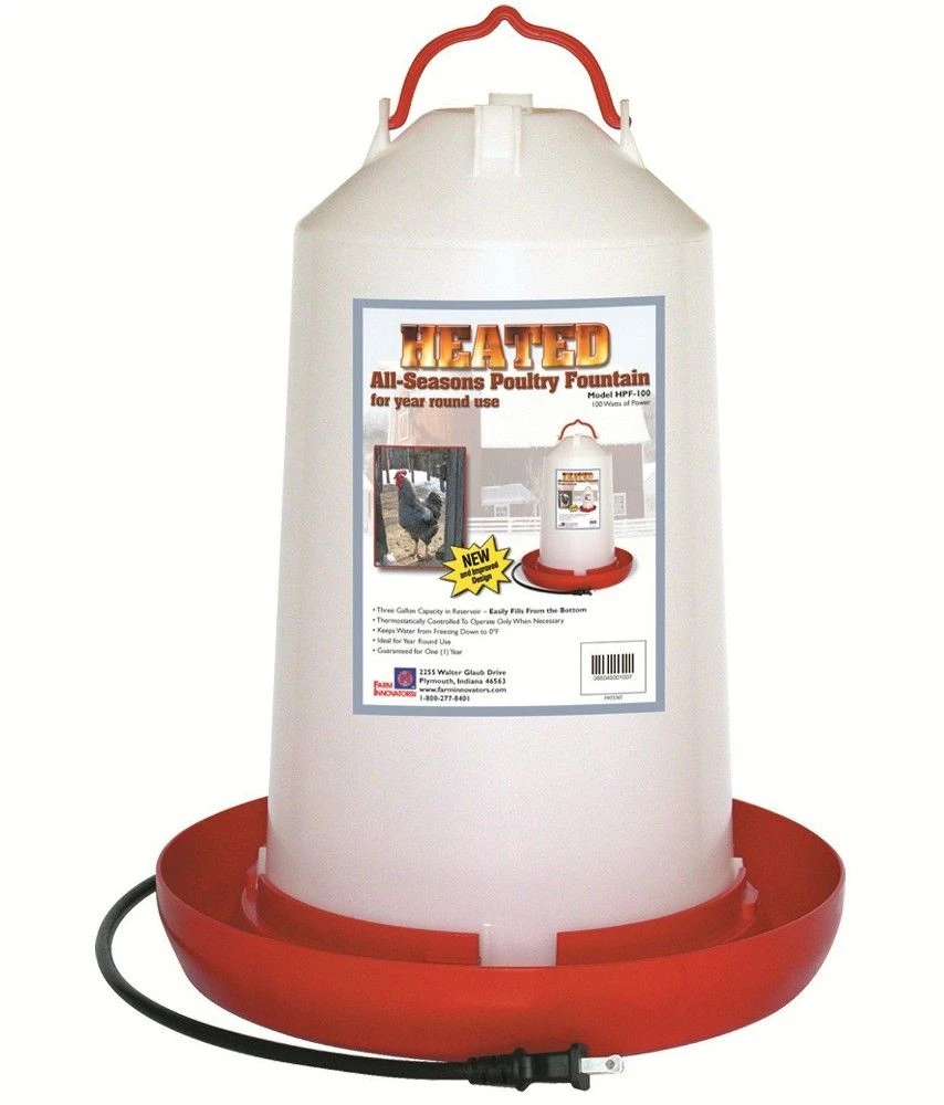 This “all seasons” heated poultry fountain is thermostatically controlled to keep water from freezing during the winter. It has an electrical connection on the base year.
